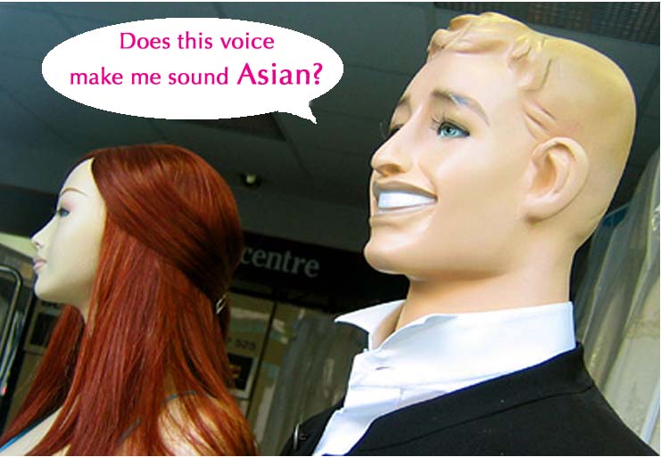 A few weeks ago, I had a commercial voice-over audition, a rare event, as I mostly do animation. This audition was for a national clothing chain which may or may not have mannequins as their spokespeople. I was reading for an Asian grandfather mannequin, and the audition consisted of one word: “Cable-knits!” (hee hee, that cracks me up right there.) At the recording studio, they informed me that there was to be no accent. I guess the mannequin was born and raised in America. I don’t question why an Asian guy has to read for an Asian mannequin that has no accent, because, really, why bite the (synthetic) hand that feeds you? So I go into the booth and give them about 12 different “Cable-knits!” ranging from the mildly surprised to the near-orgasmic. Some “Cable-knits!” gets a little chuckle sprinkled over the word, some get a warm frown-smile baked right in. Try saying “Cable-knits” 12 times. I’ll wait.