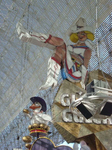 On Monday, after a night in the sumptuous accommodations of the Venetian Hotel, Choi, her boyfriend Eric and I set off on the Grand Tour of Las Vegas. First stop: Old Las Vegas. The Fremont Street Experience, as the main drag is called, consists of four blocks where a few bandstands are set up at the crosswalks and a light show plays overhead on a giant ceiling suspended over the street. The ceiling captures even the iconic Vegas Vic and Vegas Vicky. I’m sorry to see them hemmed in, without the blue sky above them.