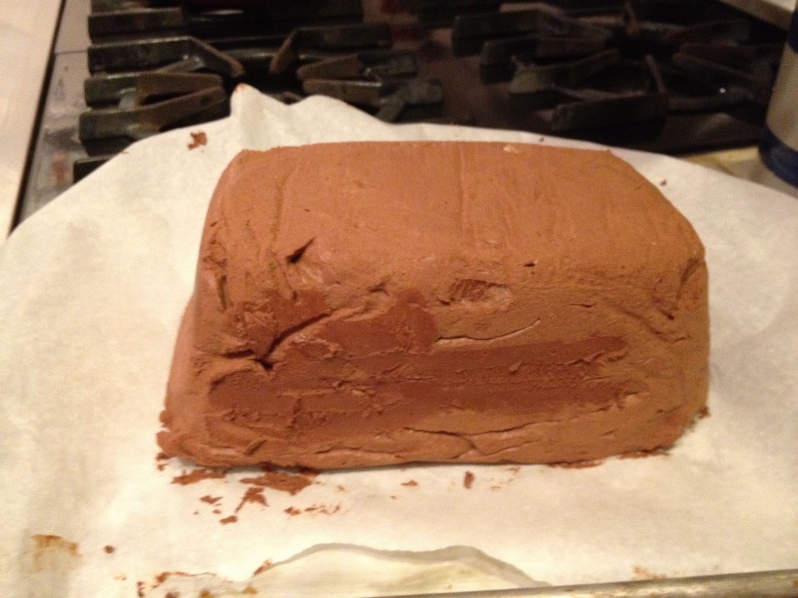 The next morning I take out the cake, and, oh, it’s a poor, poor thing. The wrinkles and folds in the parchment paper has created a brick of sadness. It’s not an elegant birthday cake, it’s a birthday TURD. Allison puts it more colorfully, if not more kindly: “It’s like a literal Yuletide log, like after a big Yuletide feast.” Yes, thanks for that, Ali. Oh, the cake looks like it should be floating in formaldehyde. Cutting the edges away is not an option; there are some deep gashes and it’s too little as it is. I stare at it in horror, much like Mia Farrow does at the end of Rosemary’s baby. What can I do with my runty chocolate abomination?